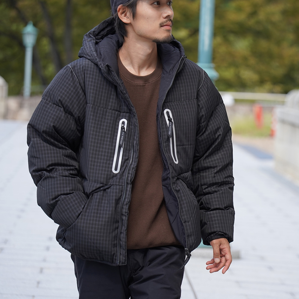 都会的印象を演出するウール素材のチェック柄がモードなダウンジャケット。