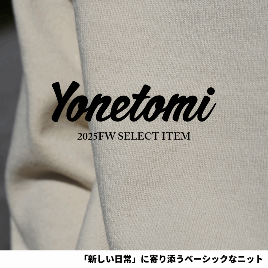 Yonetomi ヨネトミ /「新しい日常」に寄り添うベーシックなニット 2025/10/28(火) NEW ITEMSORA公式オンラインストアTOPICS 「新しい日常」に寄り添うベーシックを追求するYonetomi(ヨネトミ)。ようやく街も秋の装いに変わり、ニットの季節到来。今シーズンもYonetomiのニットが入荷しました。 【RIDID CASHMERE SWEATER Crew Neck Pullover -RAW】¥51,700.- tax incol : RAWsize : 2-4 商品ページ 着こむほどに身体に馴染んでいく、育てるカシミヤニット。上質なカシミヤ糸を贅沢に使用し、時間を掛けて繊維が切れる限界まで編み込むことでカシミヤセーターのイメージを覆す、固く丈夫な風合いを実現。また、ニット製品には欠かせない洗いや染色といった製品加工を一切せずリジッドの状態で製品化しており、着込む毎にカシミヤらしい柔らかい風合いに育ていく過程を楽しむニットです。ハリコシのある生地を活かしたヴィンテージスウェットのようなデザインで、家庭での手洗いもOKと使い勝手も良し。ワークウェアを思わせる紡績油特有の匂いも楽しみながら、是非自分だけのお気に入りの一着に育ててください。 【AMERICAN WOOL&COTTON P/O】¥26,400.- tax incol : BLACK , GREY , NAVYsize : 2-4 商品ページ アメリカ産のメリノウールとスーピマコットンを5:5で混紡したオリジナル素材を使用したニットプルオーバー。ウールの温かみと特有の膨らみ、長繊維コットンのサラッとした質感が同居したシーズンレスで着用可能の一着。少しボリュームのあるネックやゆったり目なシルエットが良い塩梅で抜け感を醸し出し、日常で非常に着易いデザインです。 【EX FINE WOOL RIB KNIT VLOUSON】¥41,800.- tax incol : BLACKsize : 3-4 商品ページ シルクのような光沢とカシミヤのような滑らかな肌触りを持つ高級ウールをしっかり編み込んだ畦編みのドライバーズニット。フロントのダブルジップ仕様やサイドポケットなどを配置させつつも、素材の品の良さをより際立たせるべく可能な限り装飾を削ぎ落したシンプルなデザイン。 【HIGH TWIST WOOL KNIT P/O】¥26,400.- tax incol : BLACK , NAVYsize : 2-4 商品ページ オールシーズンで着られるハイゲージニット。定番的なシンプルなデザインのニットは、滑らかな肌触りが特徴な強捻防縮ウールを採用。オンオフ問わずでコーディネートの幅を広げる1着です。 シンプルなデザインの中に拘りが詰まった、Yonetomiのニット。寒くなる季節に1枚は手に入れておきたいものです。 ブランドページ 最近の投稿 Yonetomi ヨネトミ /「新しい日常」に寄り添うベーシックなニット 【THE NORTH FACE Purple Label / ザ ノースフェイス パープルレーベル】25FW STYLE LOOK Vo.2 【Gramicci andwander / グラミチ アンドワンダー】25FW Collaboration Item 【patagnia / パタゴニア】 M’s R1 Air Crew & Jacket 【orSlow × SIERRA DESIGNS】 COVERALL